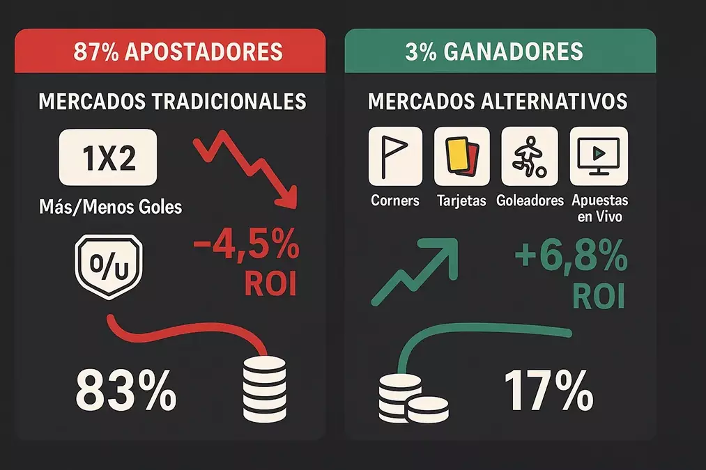 Mira, los mercados alternativos no son magia. Son trabajo. Requieren bases de datos, tracking, análisis, paciencia. Pero funcionan porque el 87% de apostadores no se molesta. Siguen apostando 1X2 donde las cuotas son eficientísimas y el edge es imposible.